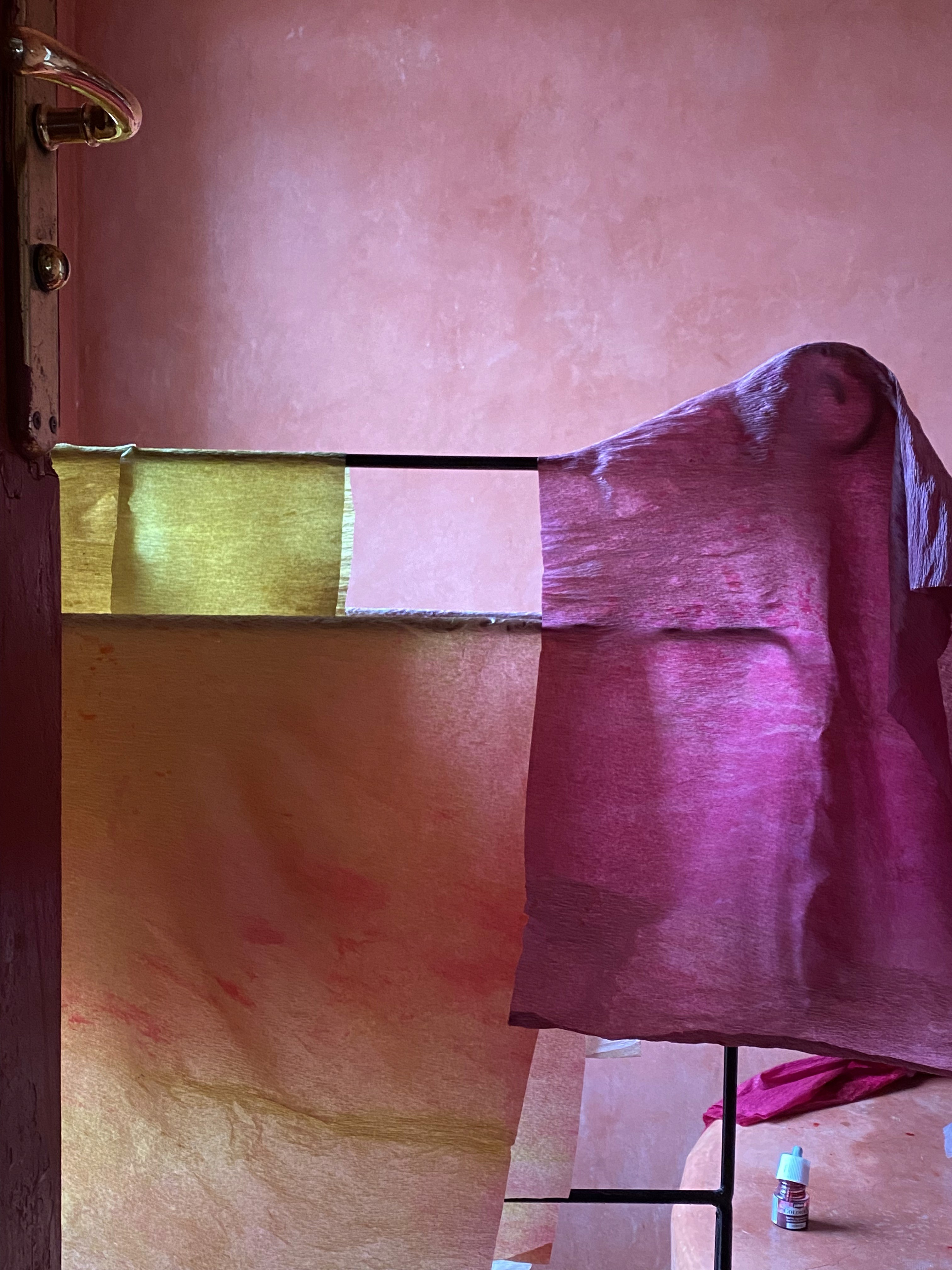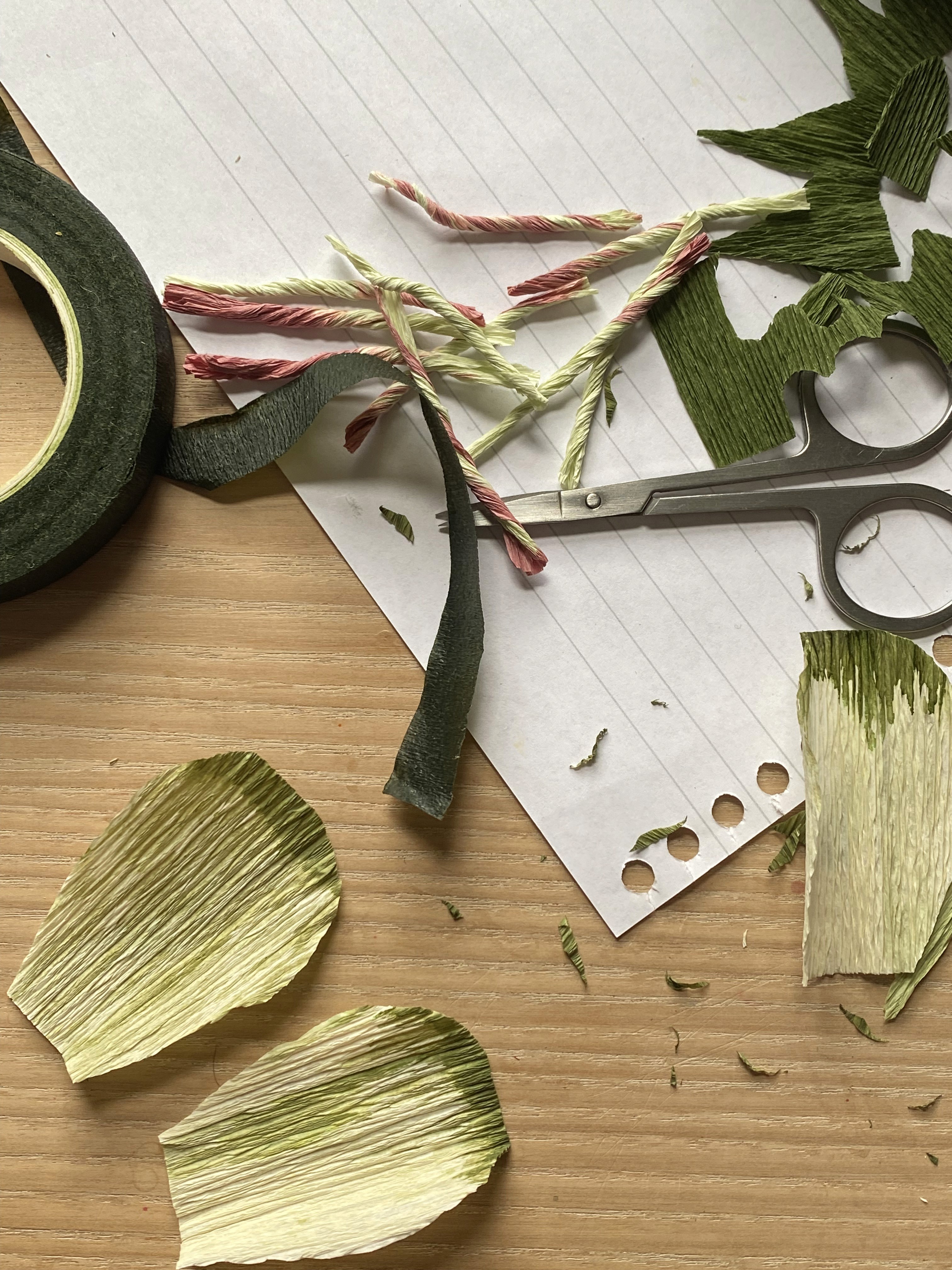 Italian crepe paper begins tightly compressed on the roll. First, a long cut through it, separating one length from the rest. Then it is cut again into smaller forms. Pigment is mixed by hand.